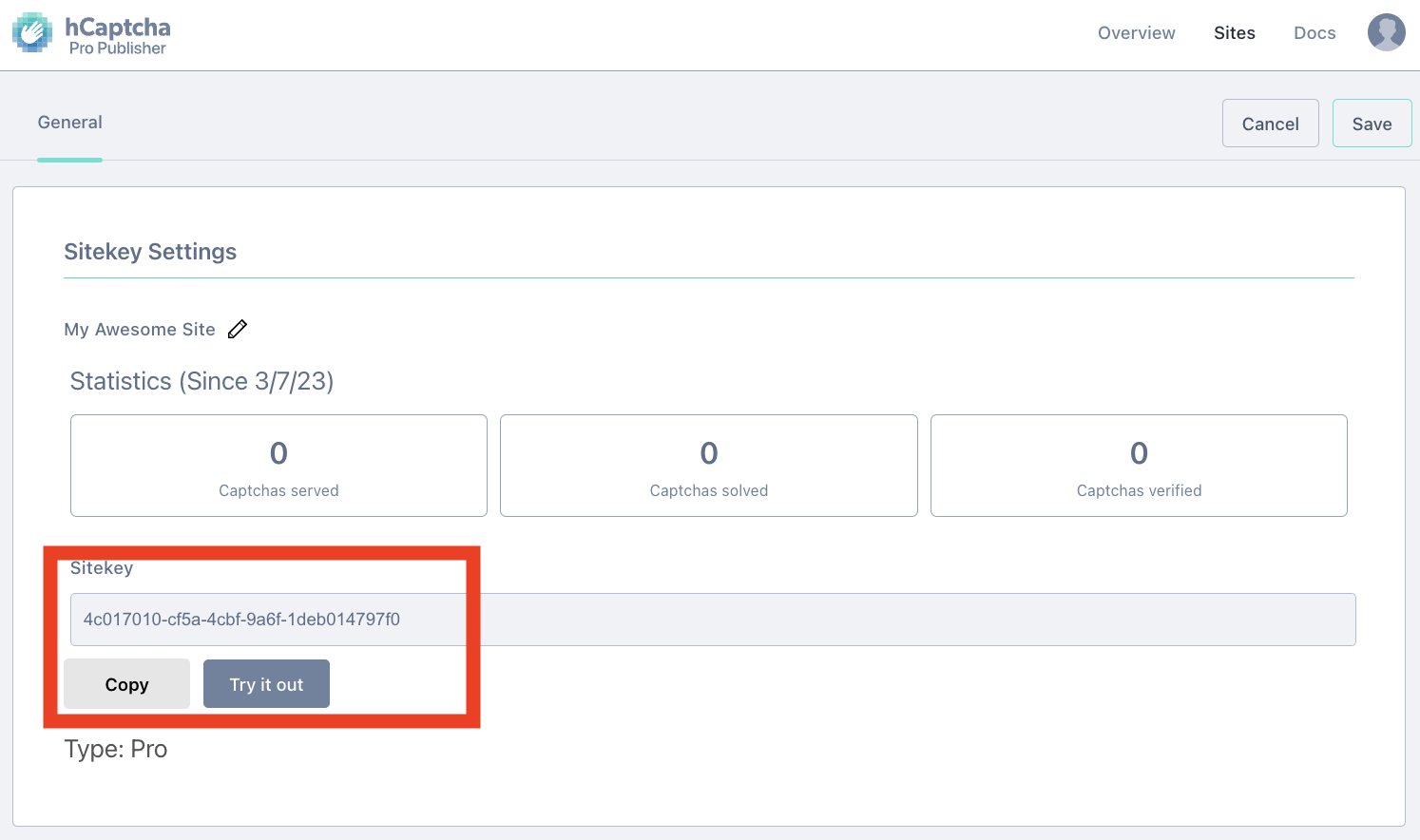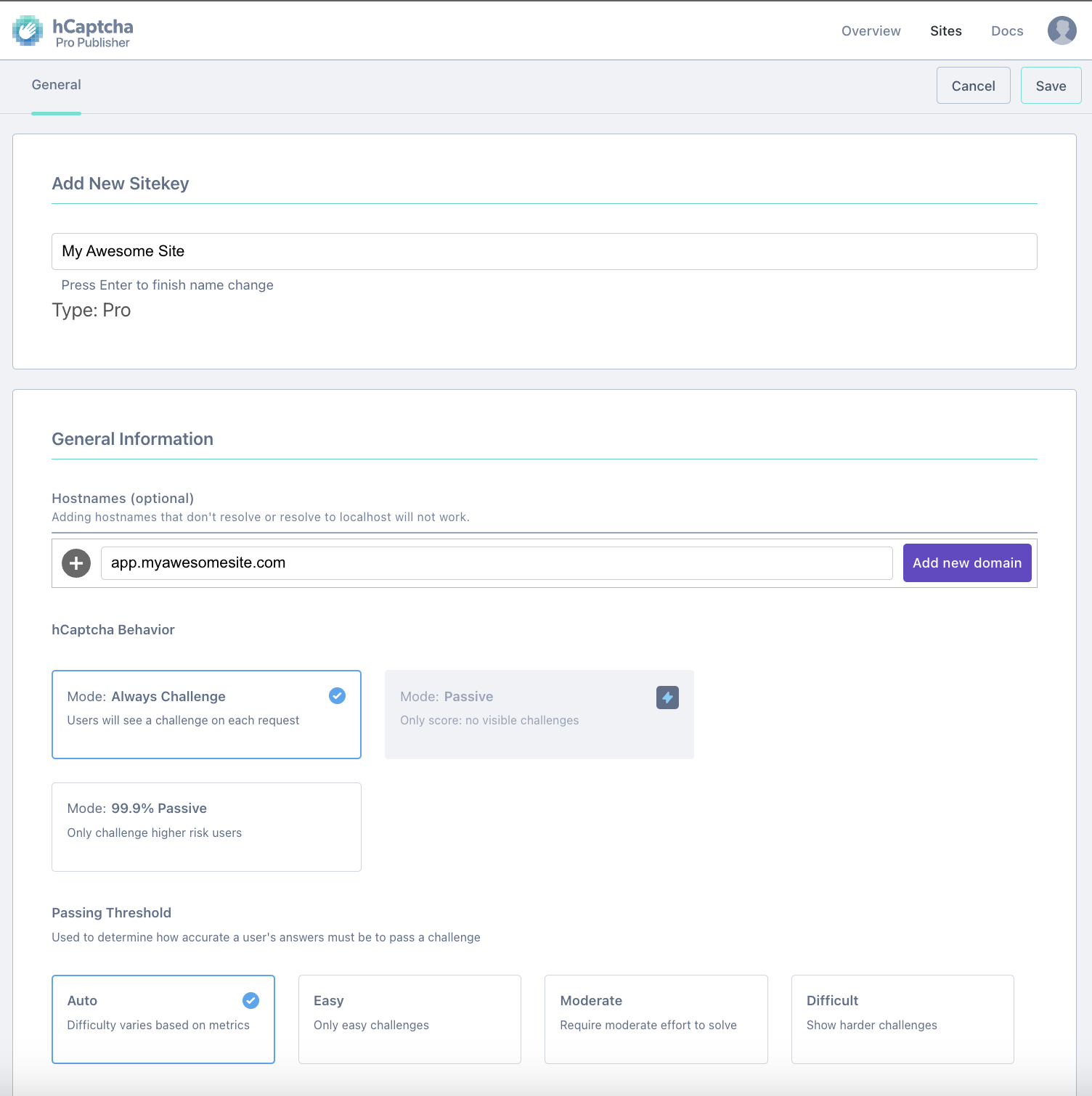 To get started, you must first create an hCaptcha account.- Sign up for a new account on hCaptcha - We recommend considering upgrading to the “Pro” plan, which allows for “passive” and “friction-free” modes.