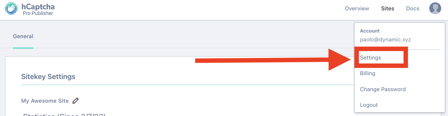 Get your secret key - This is used by the Dynamic server-side backend to verify the captcha result from the SDK, and is never leaked to the SDK. To get your secret key, click on your account profile on the upper right corner and select “Settings”. You should see your plaintext secret key, which you should also copy to set up in Dynamic.